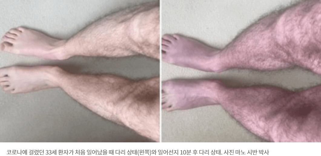 새로운 장기 코로나 바이러스 후유증(Long Covid)이 발견되어 화재입니다. 영국 33세 남성은 일정시간 서있으면 다리 혈관이 심하게 부풀어 오르는 병증으로 진료를 받으러 왔습니다. 그는 10분 정도 서있으면 다리가 푸른색으로 변하는 푸른 다리증상(blue legs symptom)으로 체위 기립성 빈맥 증후군(diagnosed with postural orthostatic tachycardia syndrom POTS)이라는 판정을 받았습니다. 그의 주장에 따르면 이러한 현상은 코로나 감염 이후 시작된 것이라고 합니다.