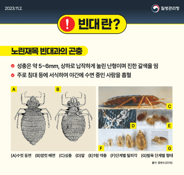 현재 공동 숙박시설에서 빈대가 출몰하면서 정부관계부처( 질병관리청, 보건복지부, 교육부, 환경부, 문화체육관광부, 고용노동부 등)에서 빈대 관리 및 방제방안에 대해 대책을 논의하였다고 합니다. 11월부터는 공항 출국장, 해외감염병 신고센터에서 빈대 발생 국가를 오가는 출입국자들과 화물수입 기업을 대상으로 해충 예방수칙을 안내하고, 검역소 구제업무를 강화할 계획이라고 합니다.